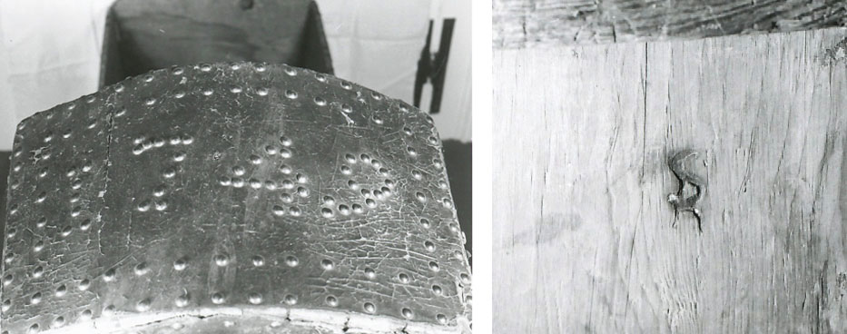 Leather and brass tacks over white pine
